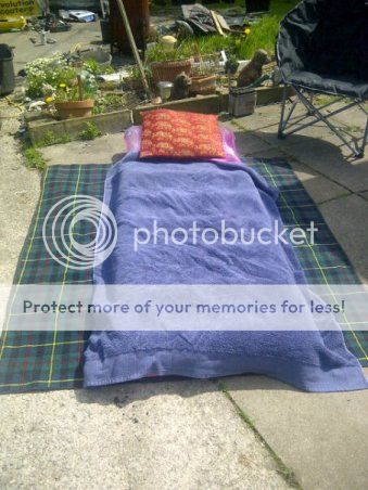 Edit: here you go. Not a brilliant pic but you get the idea. The sideways slabs form a retaining wall which has a sloping rockery down to the grass level alongside it. There are 2 steps down just behind the black chair, and a step in the concrete on the other side.
