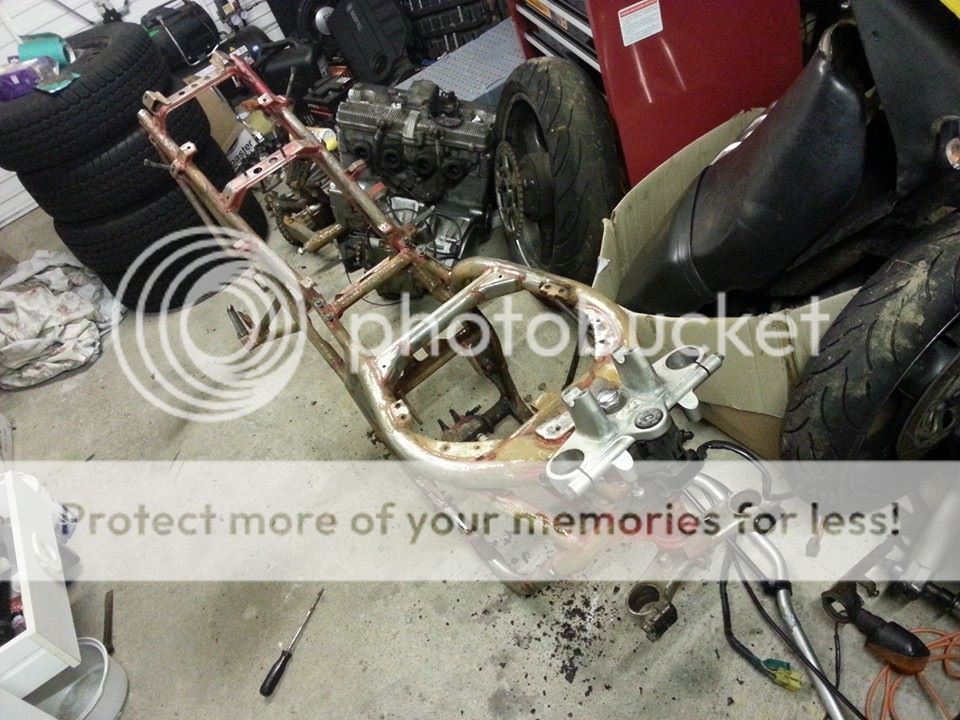 Here is a photobucket link to the most recent pic. since then I have removed the yokes, bearings, races, pillion pegs and all the nuts and bolts etc. shall get a before and after powder coating when I get the chance Smile