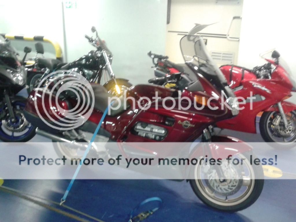 Excuse the fuzzy phone pic. Got checked in and onto the boat. Couple of jolly Dutchmen came and strapped everyones bikes down, made sure they were all safe.