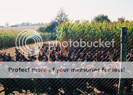 One of the most welfare friendly ways I've ever seen of raising commercial poultry were free-range turkeys in France. They kept them in a field of maize surrounded by secure fencing and occasionally chopped down a row of the maize for them to eat. They were free to run ofrf into the dense vegitation if they felt threatened, or nosy at passing cyclists. Happy and secure.