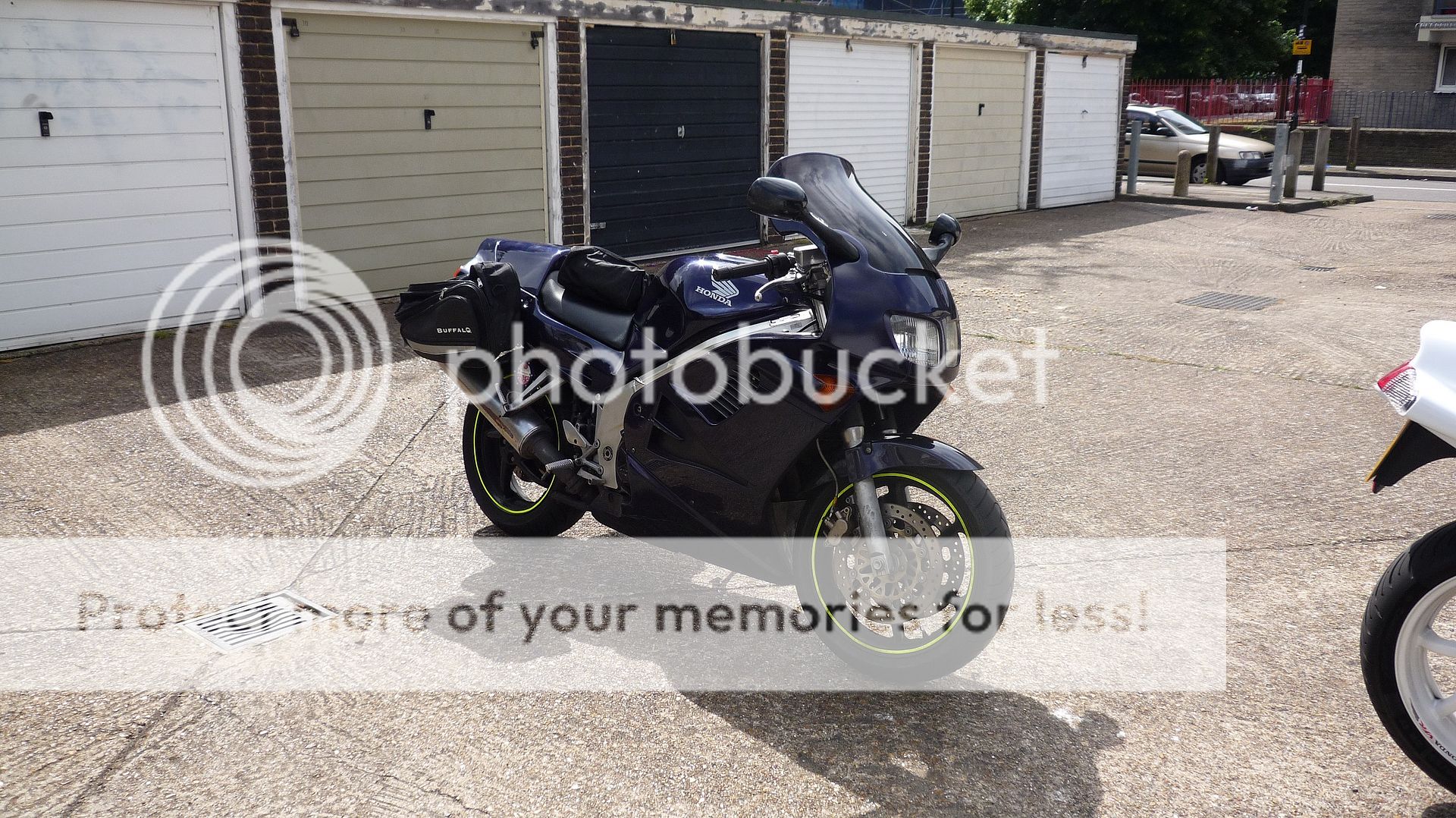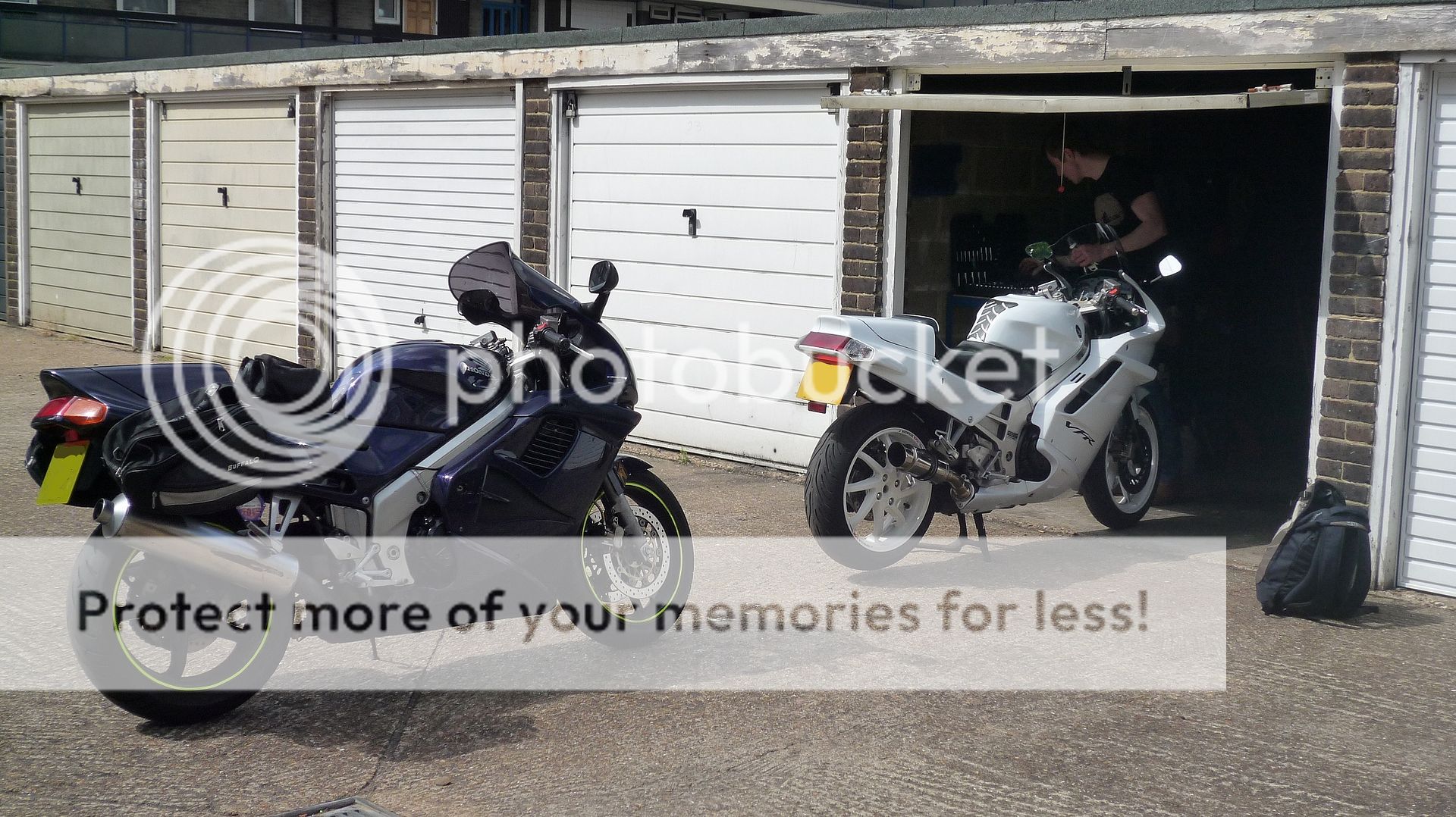 At my mate's garage, his is the near-immaculate white RC36 I, mine's the tatty RC36 II behind with droopy panniers: