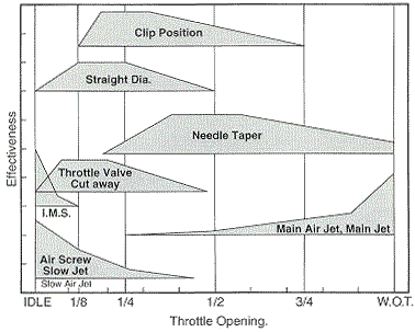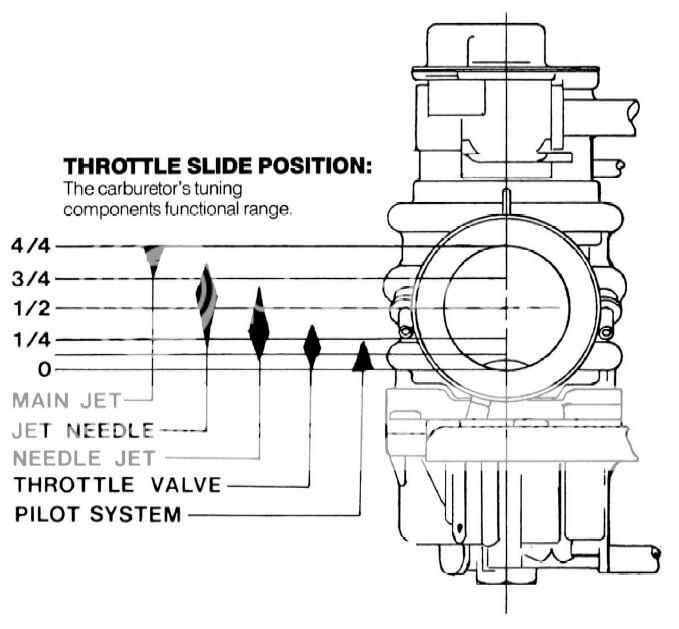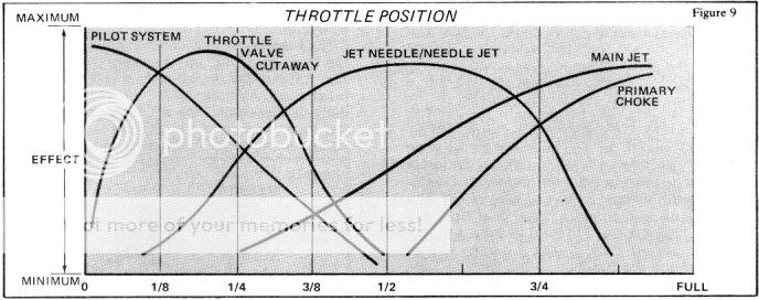 The instructions that came with the kit suggested that the pilot jets can be left as standard,but that a hole needed to be enlarged in the CV carb slide so as to change how this lifts when that circuit was enabled.looking at the diagram you can see which component comes into play at a given throttle opening.What it does not show is that on a CV carb the slides do not start to open until around 5-6,000 rpm,so up to those engine revs it is mainly the air screw,float height and pilot jets.