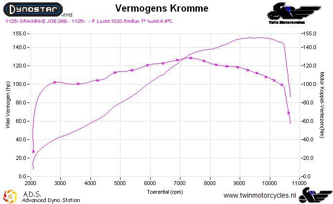 That Dyno graph don't lie, a TWIN motorcycles slip on, ECU remap and KnN filter and that thing's putting out 144 RWHP and 90 ft/lbs of torque. This dyno graph is of Joe's stock motored 1125 straight line bike which runs 9.1 in the quarter mile, that's the same time you'd expect out of a tweaked, stretched, slammed 2005 GSXR 1000 drag bike.
