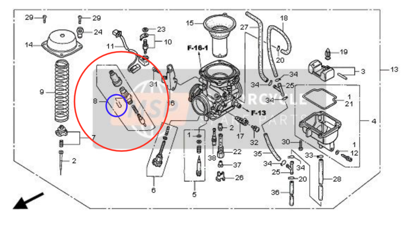 I have a Honda 250 from 2004, the choke was sticking on so I dismantled the cable and pulled out this thing from the engine or carburettor. During my destroy it myself (DIY) job I have managed to lose the spring which I guess is important but the problem lays with trying to find the part. This part was connected to the bottom. I have checked various different Honda parts websites and cannot see it on the diagrams.