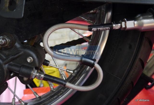 The rear caliper has some weird twisty hard line attached to the bracket which seems a bit unnecessary.