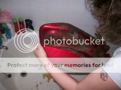 She missed the first step which was to rince and slosh repeatedly with warm soapy water. And hell of a lot of friable shit came out on the first few shakes and swills.