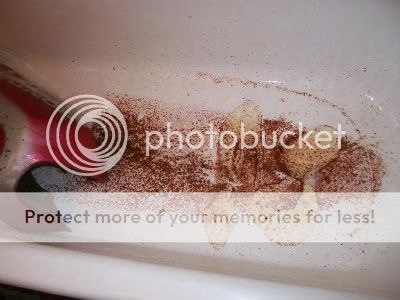 She tipped in a 36p bottle of ASDA's own brand that was on the shelf, and shook it around a bit, left it over night, shook it around a bit more, left it a few hours longer, then rinced it out with water, and all that shit in the bottom of the bath is what came out JUST with the vinegar.